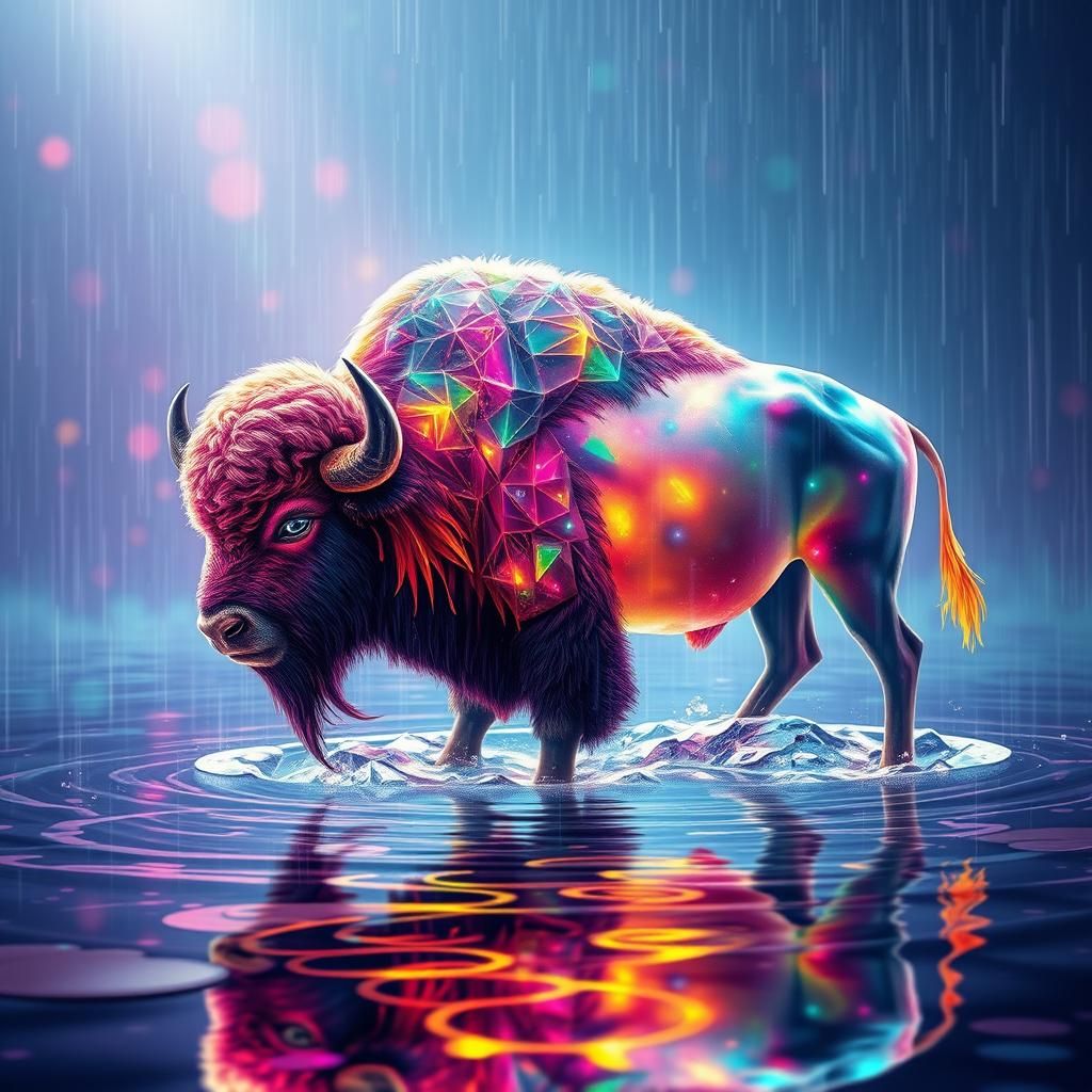 A surreal image of a cosmic bison in a rainstorm. The ethereal scene features vibrant, translucent colors, glassy water reflections, and dreamlike geometrical landscapes in a digital painting style.
