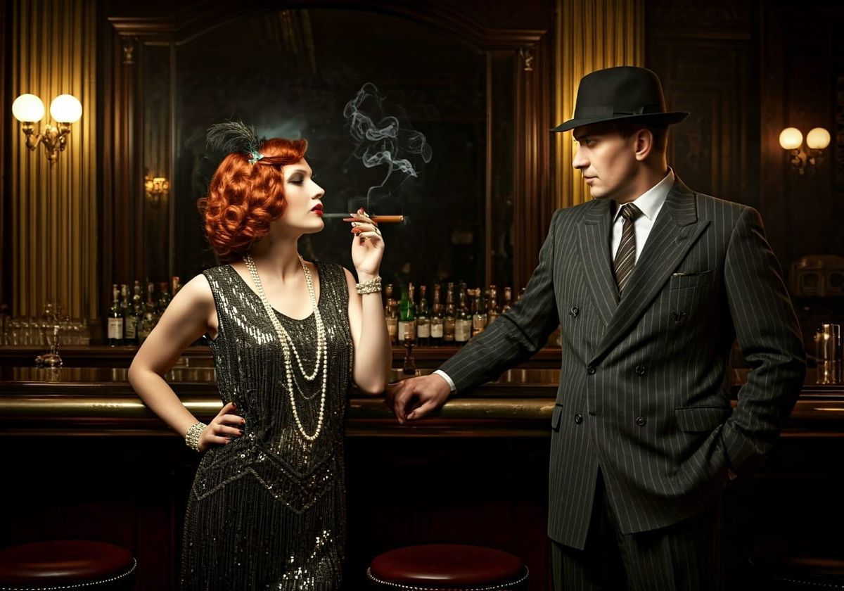 This image shows a glamorous flapper with red hair smoking a cigarillo and leaning towards a gangster inside a vintage speakeasy. The scene is lit with dramatic chiaroscuro in a 1920s aesthetic.