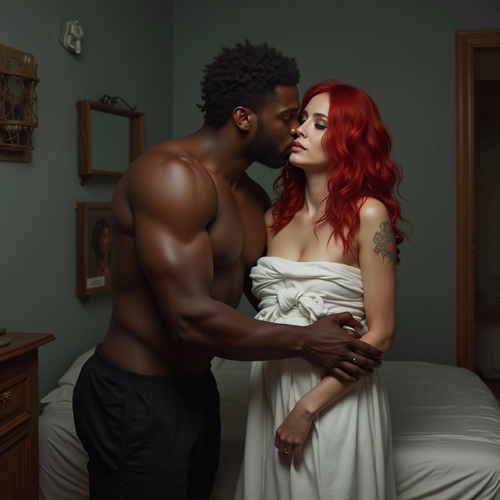 This image shows a black man passionately kissing a red-haired woman in a dimly lit bedroom. The scene is a detailed matte painting with deep colors and intricate details.