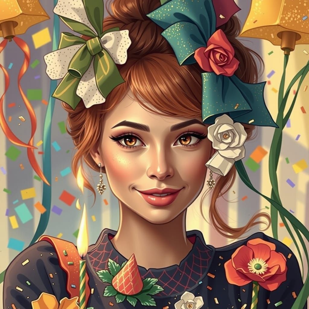 A vibrant pop art illustration of a smiling woman holding a birthday cake. The digital art features bright colors, bold lines, glittering confetti, and warm golden lighting.