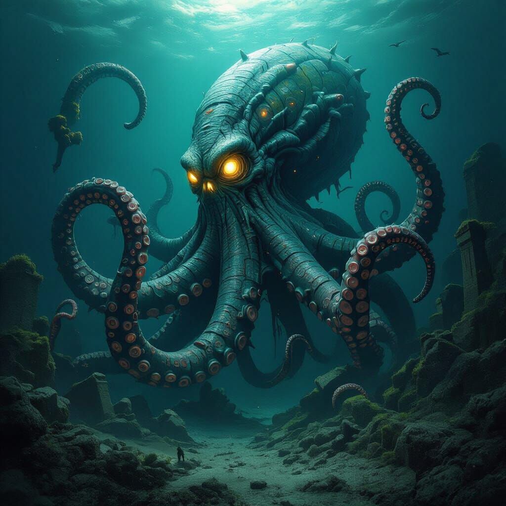 A dramatic image of a Kraken-like mythological sea creature amidst submerged ruins. The scene, set in the ocean's depths, features detailed textures and a somber, mysterious atmosphere in a surrealist style.