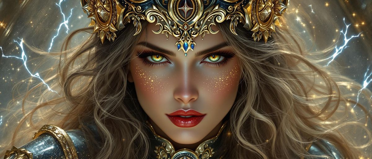 This image shows a stunning sorceress with intricate details, wearing video game-inspired armor and adorned with bright eyes and glossy lipstick, set against a backdrop of hyper-realistic painting techniques reminiscent of fine art masters