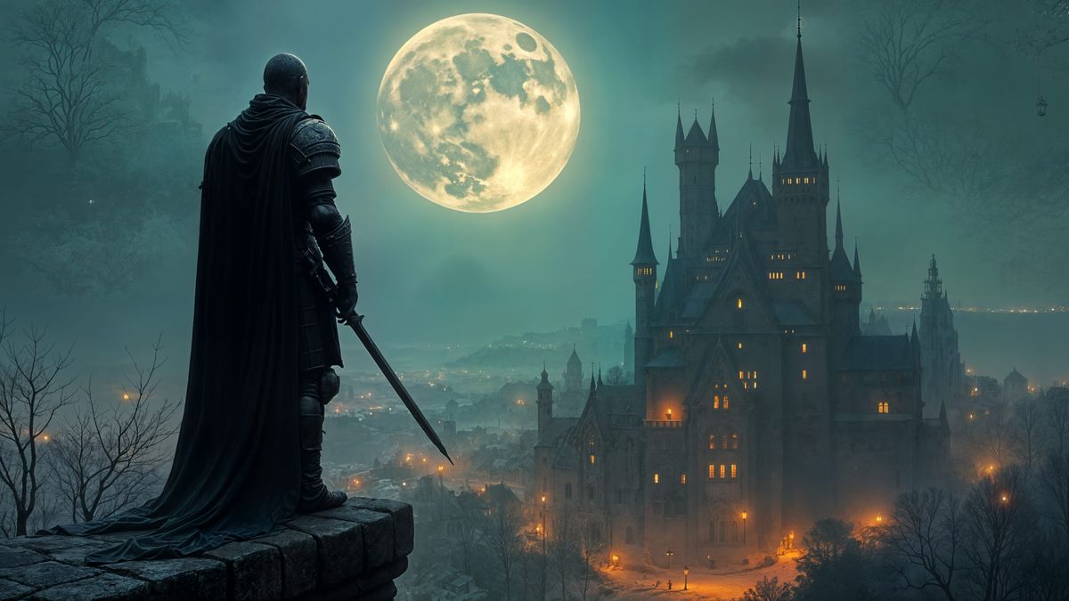 This image shows the spectral form of a warrior observing a medieval village from a castle tower. Lanterns cast a warm glow against the backdrop of a large, awe-inspiring moon in dark fantasy style.