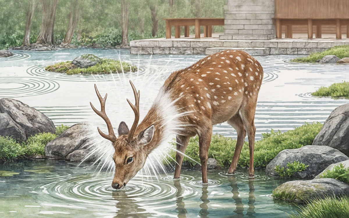 This image depicts a Sika deer drinking from a pond in a Japanese temple garden, bathed in divine light with an ethereal glow, rendered in a watercolor wash style.
