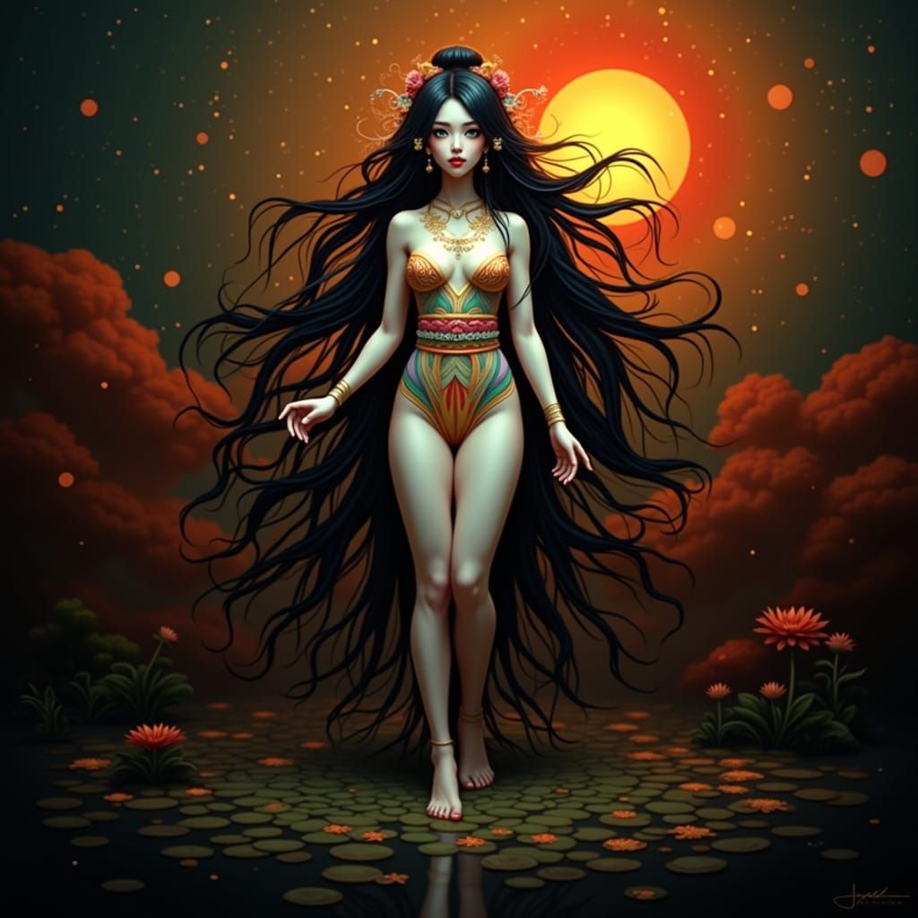 A striking picture of a geisha in a colorful dress, reflected in a mirror. The portrait features intricate golden patterns, a pond with irises and chrysanthemums, and a glowing cosmic backdrop.