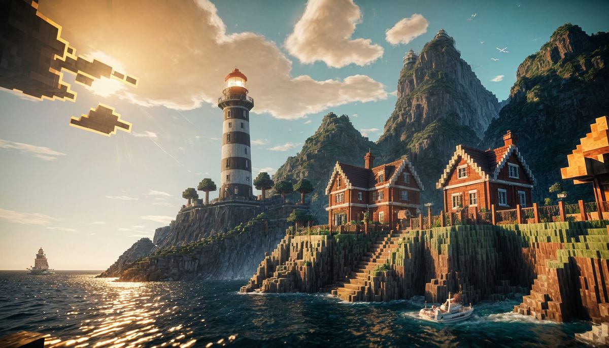 (Minecraft au bord de la mer, Minecraft by the sea lighthouse sailboats nighttime:1.3) 8K resolution 64 megapixels soft focus 3D Game Cinema...