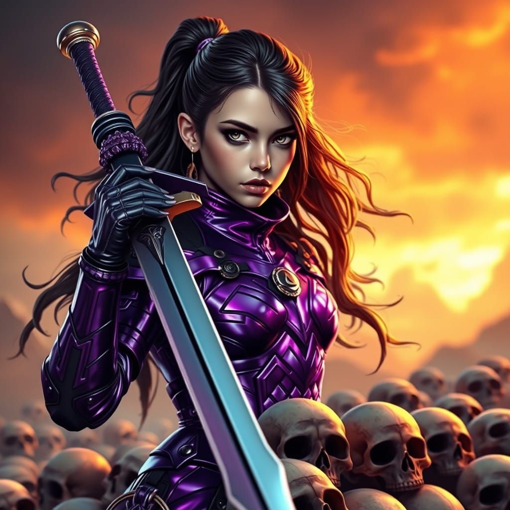 This image shows a strong, elegant woman in high-gloss purple latex armor, holding a majestic sword and standing heroically on a hill of skulls, with a fierce expression. The artwork features vibrant colors, intricate textures, and dynamic lines, reminiscent of cinematic art and trending Splash art.
