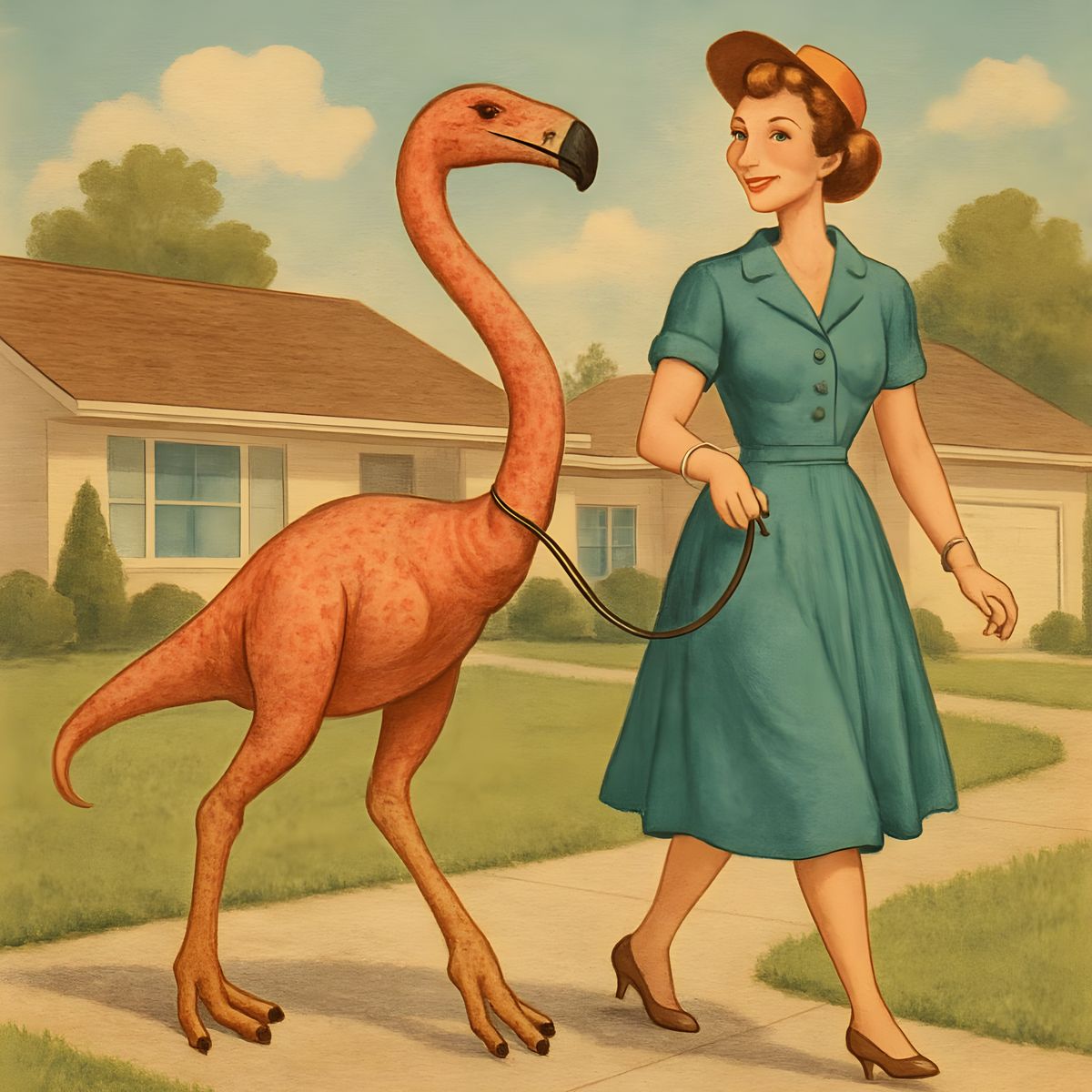 This image shows a vintage woman walking a pet flamingo dinosaur. A suburban house and car are in the background of this charming vintage illustration.