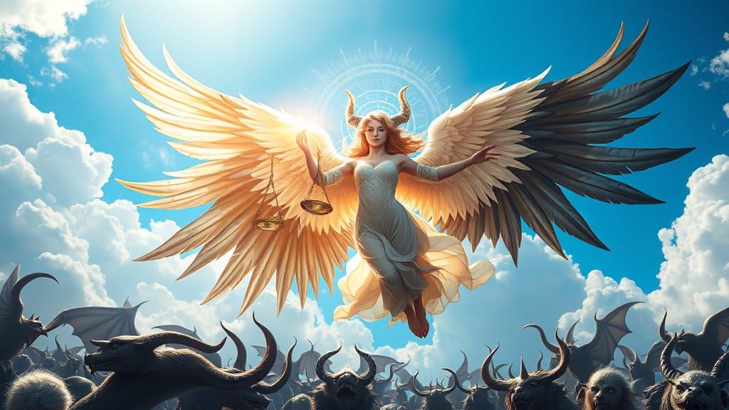 This image depicts a winged woman with angelic and demonic wings, radiating an ethereal glow as she disperses mystical powers to mortals and demons below, in a grand, sweeping gesture of divine balance, reminiscent of high-fantasy illustration and Renaissance art.