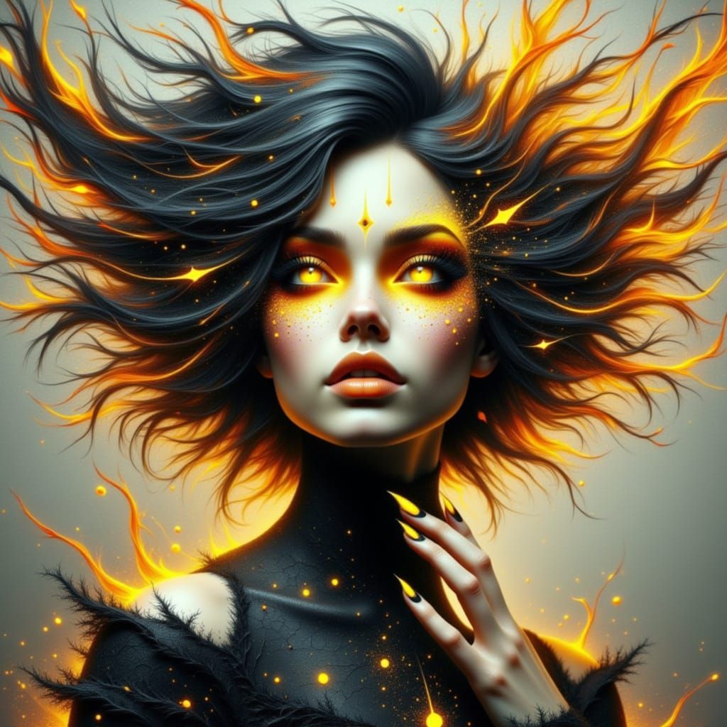 This image shows a woman with glowing amber eyes, bathed in a warm, ethereal light. The portrait evokes a sense of inner fire and mystical beauty.