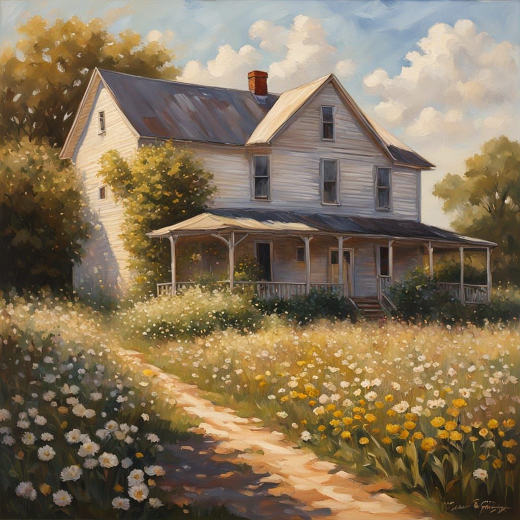 A striking picture of a weathered white farmhouse surrounded by a field of flowers. The sunlight illuminates the rustic textures, creating long shadows in an oil painting style.