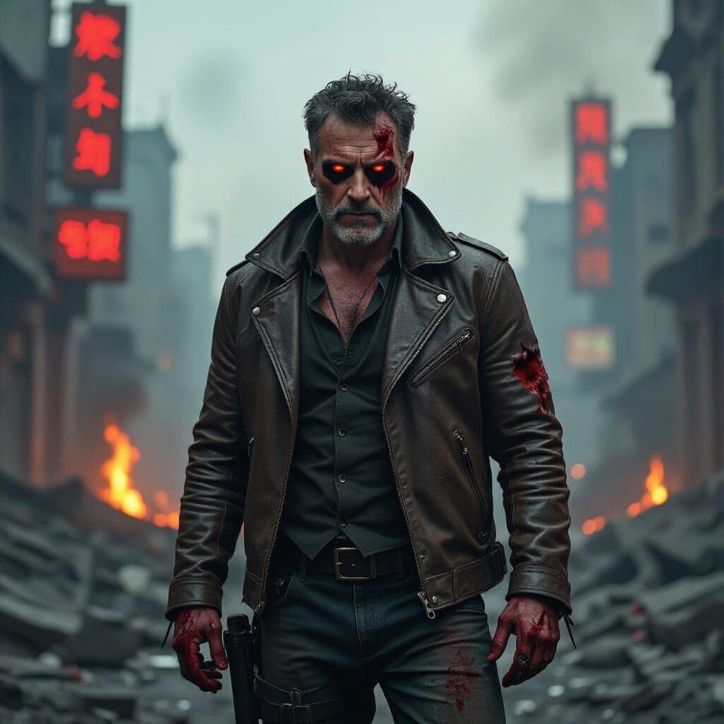 This image shows a man in a leather jacket standing in burning city ruins. The picture is composed with ochre, gray and red hues and a gritty VHS texture to achieve a vintage aesthetic.