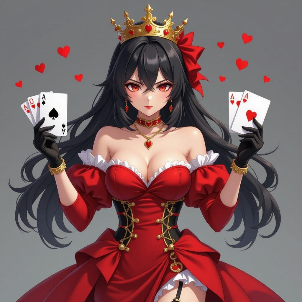 This image shows an angry woman with black hair wearing a red dress, checks, hearts, and a gold crown holding playing cards. This 3D anime art is extremely detailed and aesthetic.