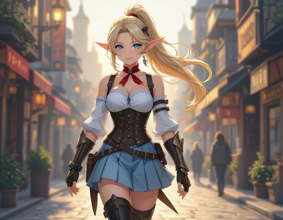 A female elf adventurer explores a vibrant fantasy-industrial city. This anime-style artwork features detailed character design, golden hour lighting, and volumetric fog for an ethereal glow.
