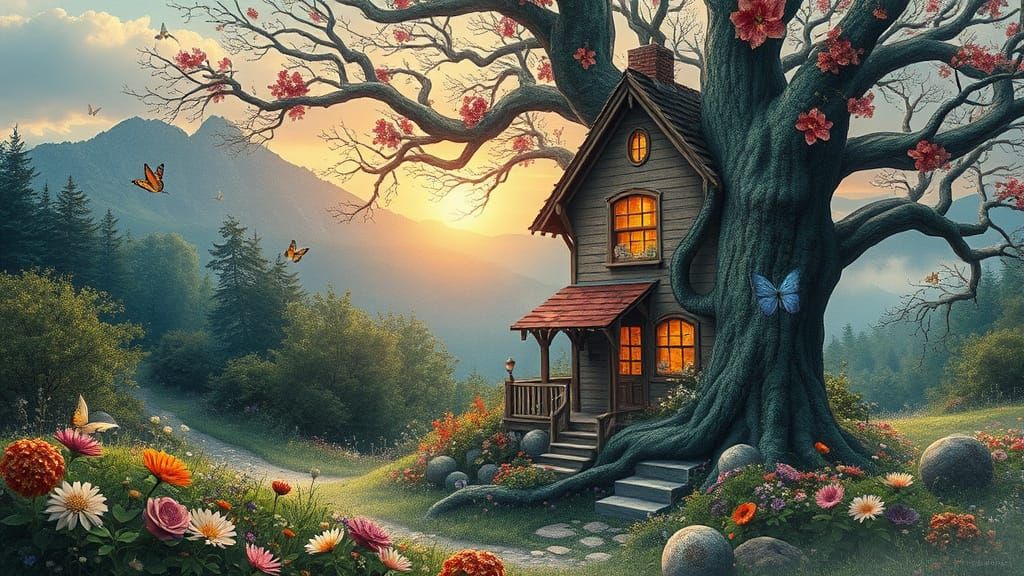 A surreal digital watercolor illustration of a whimsical Victorian cottage nestled in a flower meadow. The cottage has dendritic rooms and is depicted with elements of macro photography and a double exposure effect.
