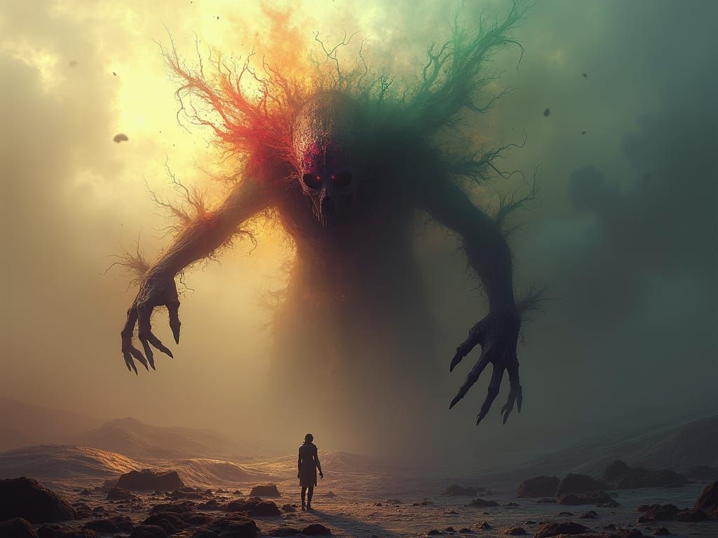 This image shows an abstract, vaguely humanoid figure composed of swirling colors. The otherworldly being seems suspended over a turbulent landscape, rendered with high contrast and surreal textures.