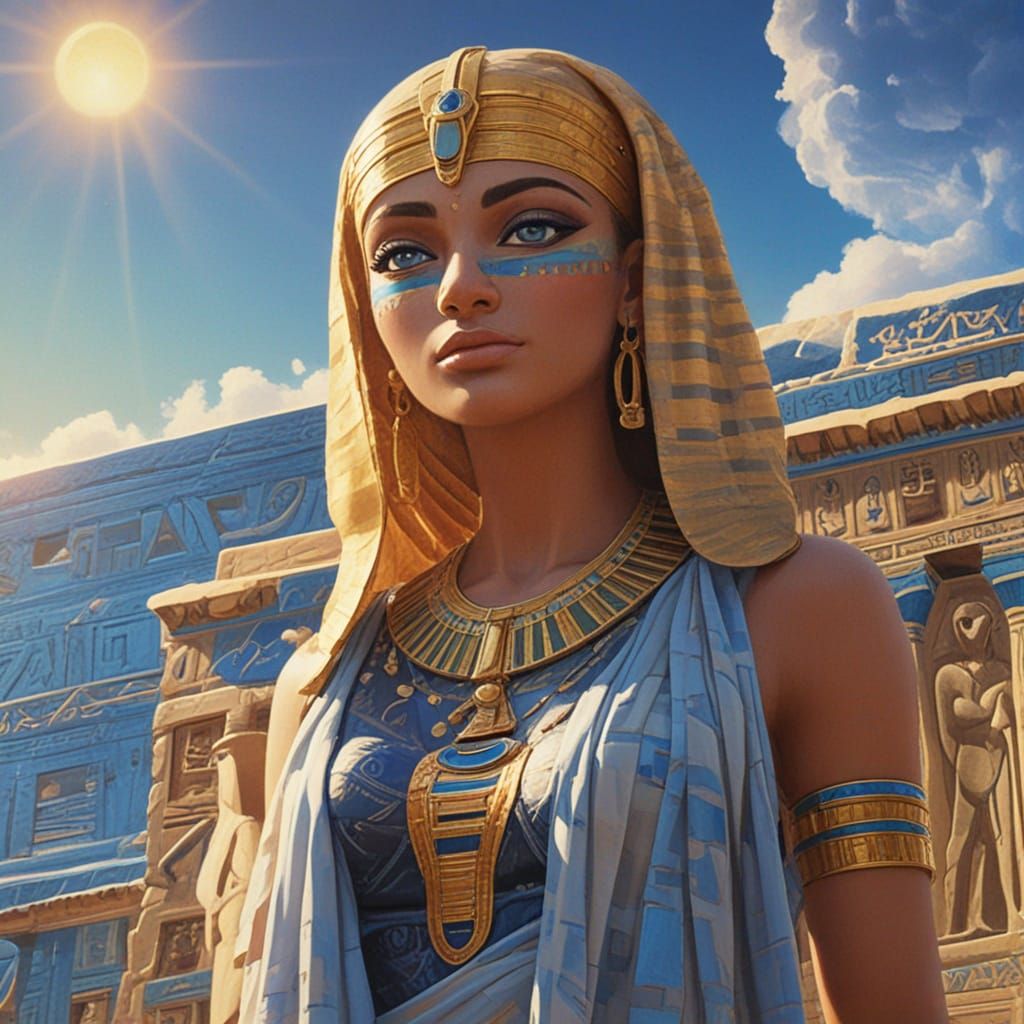 This image shows a dancing mummy with sapphire eyes in an ancient temple. The vibrant oil painting features glowing golden hieroglyphics and warm sunset lighting.