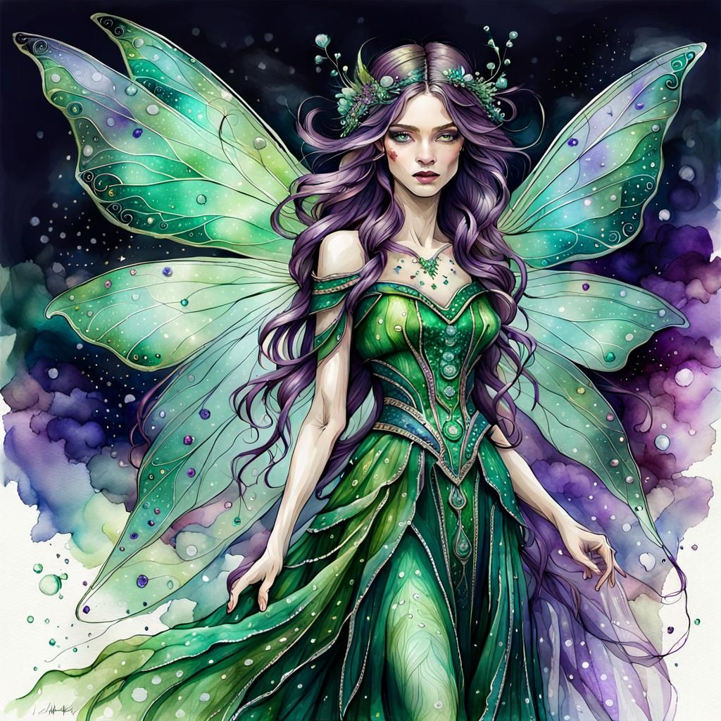 A vivid image of a green fairy in a flowing gown. The artwork is a digital painting with watercolor and alcohol ink textures, creating a detailed and maximalist scene.