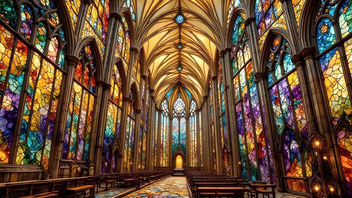 This image showcases a 3D stained glass cathedral nave with vibrant colors, intricate patterns, and luminous effects. Features thick contour lines and glass-like facets with a crisp, vector-like finish.