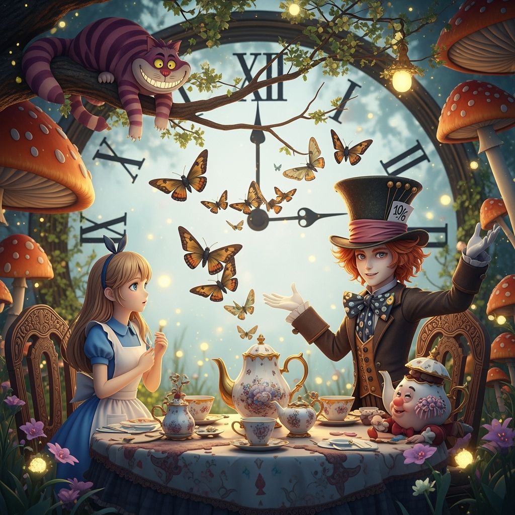 A whimsical tea party scene featuring Alice, the Mad Hatter, Cheshire Cat, and Dormouse, surrounded by fluttering moths representing seconds escaping a clock face, rendered as detailed 3D anime art.