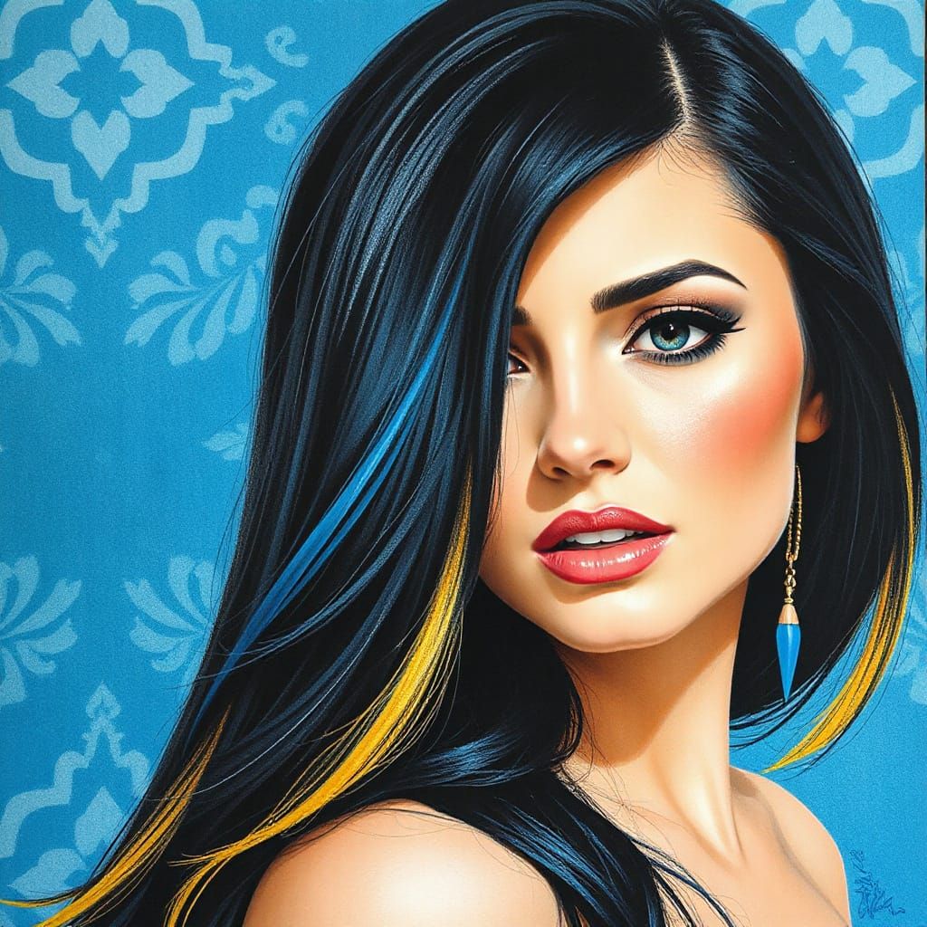 This image features a close-up, realistic portrait of a Ukrainian woman with long black hair and striking yellow and blue highlights. Her bold makeup and expressive eyes are rendered with delicate pencil strokes on an abstract blue background.