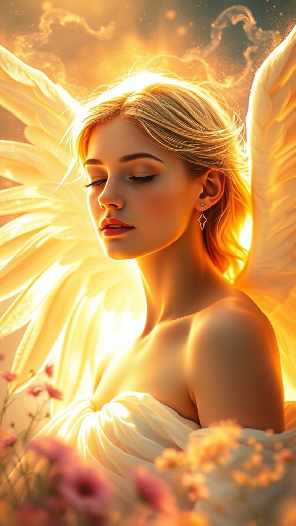 A striking picture of a radiant angel bathed in golden light. Soft white wings and a peaceful aura surround her in a heavenly garden, depicted with vibrant colors and intricate detail as splash art.