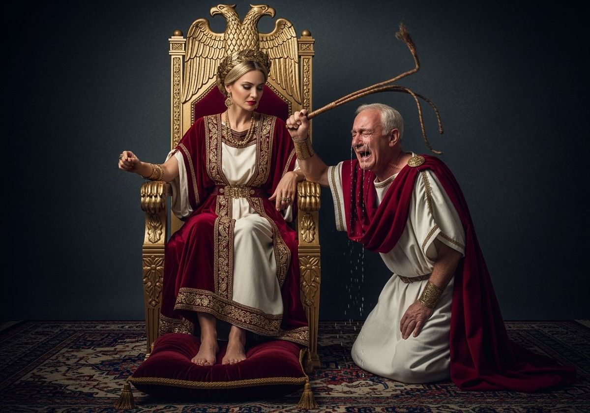 This image shows a Roman Empress in imperial attire seated on a golden throne. An elderly senator kneels before her, weeping as she whips him. The image is reminiscent of professional portrait photography.