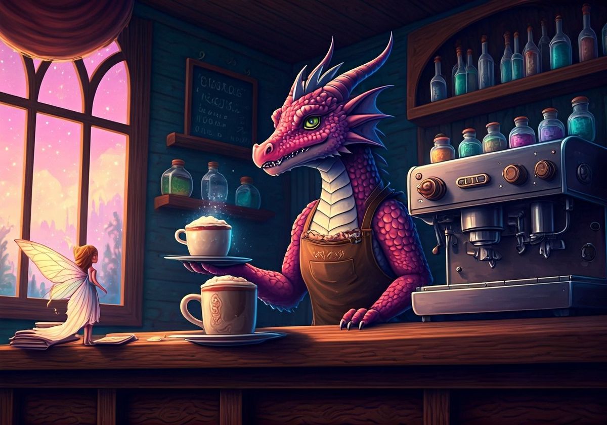 This image shows a whimsical fantasy scene inside a magical cafe. A dragon barista serves a fairy a cappuccino amid potions and an espresso machine, with a synthwave neon retro aesthetic.
