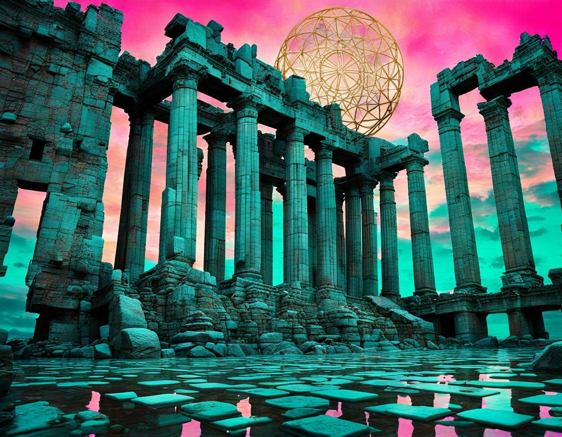 This image shows beautiful ruins and runes under a pink sky. The artwork features golden spheres and vertical lines, rendered with delicate brushstrokes and diluted watercolor techniques in bright pastel colors.