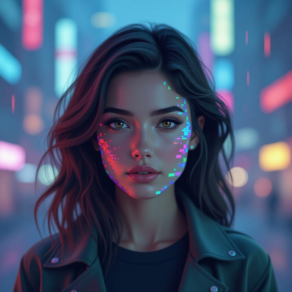This image shows a digital portrait of a woman with fragmented features in pixelcore style. It features 8-bit textures, chromatic aberration and cinematic lighting against a chaotic digital background.