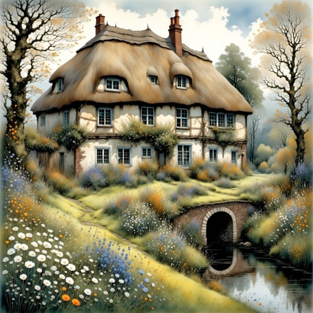 Create charming North Frisian cottage images with our free AI image generator. Easily customize your own thatched roof houses and gardens.