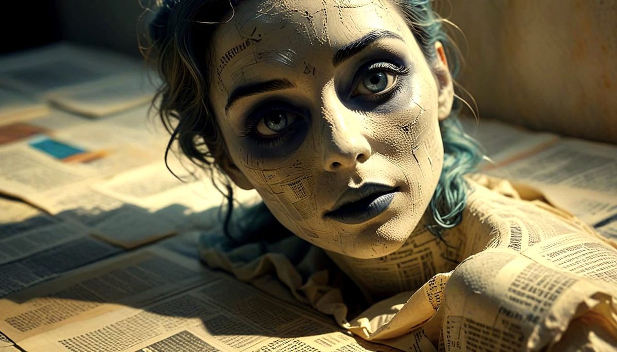 A mystical female figure is subtly rendered in a dreamlike atmosphere, with her shadow cast on a background of newsprint, surrounded by a surreal blend of technical drawing and painterly elements, evoking a sense of sci-fi wonder and eerie beauty.