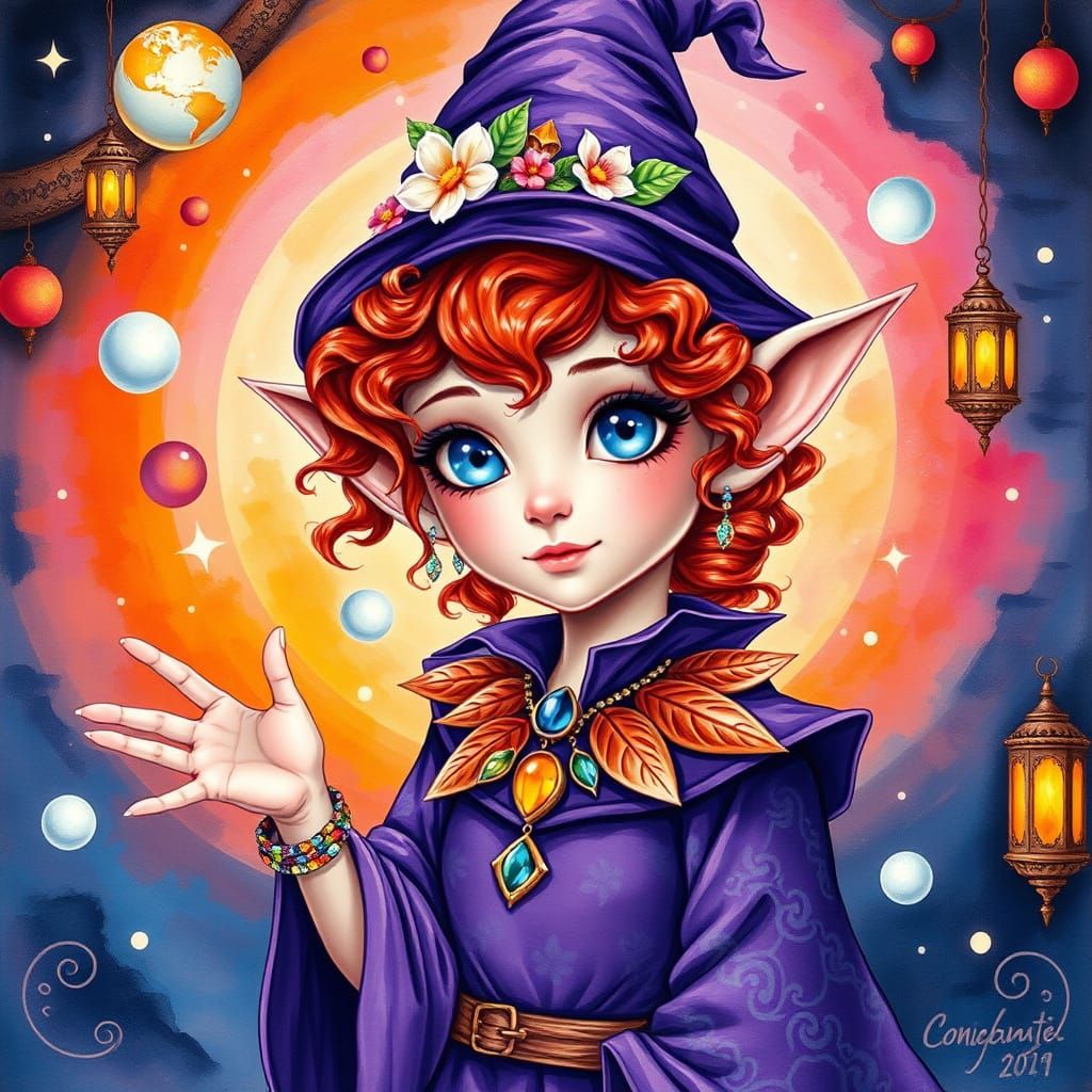 This image showcases a whimsical elf girl, set against a kaleidoscopic background, with intricate details and textures reminiscent of Impressionist masterpieces.