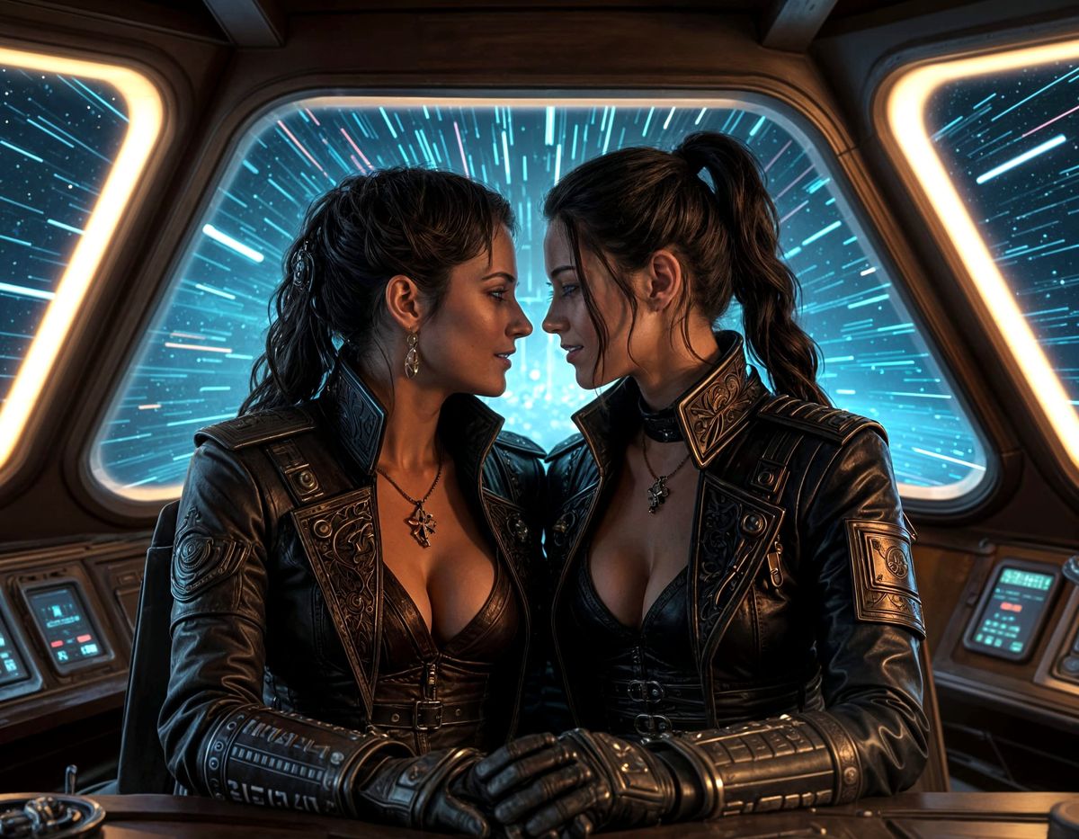 A cinematic image of two space pirate captains sharing a tender moment on their ship's bridge. Stars streak past the viewport, with volumetric and rim lighting in a rococo-wave style.