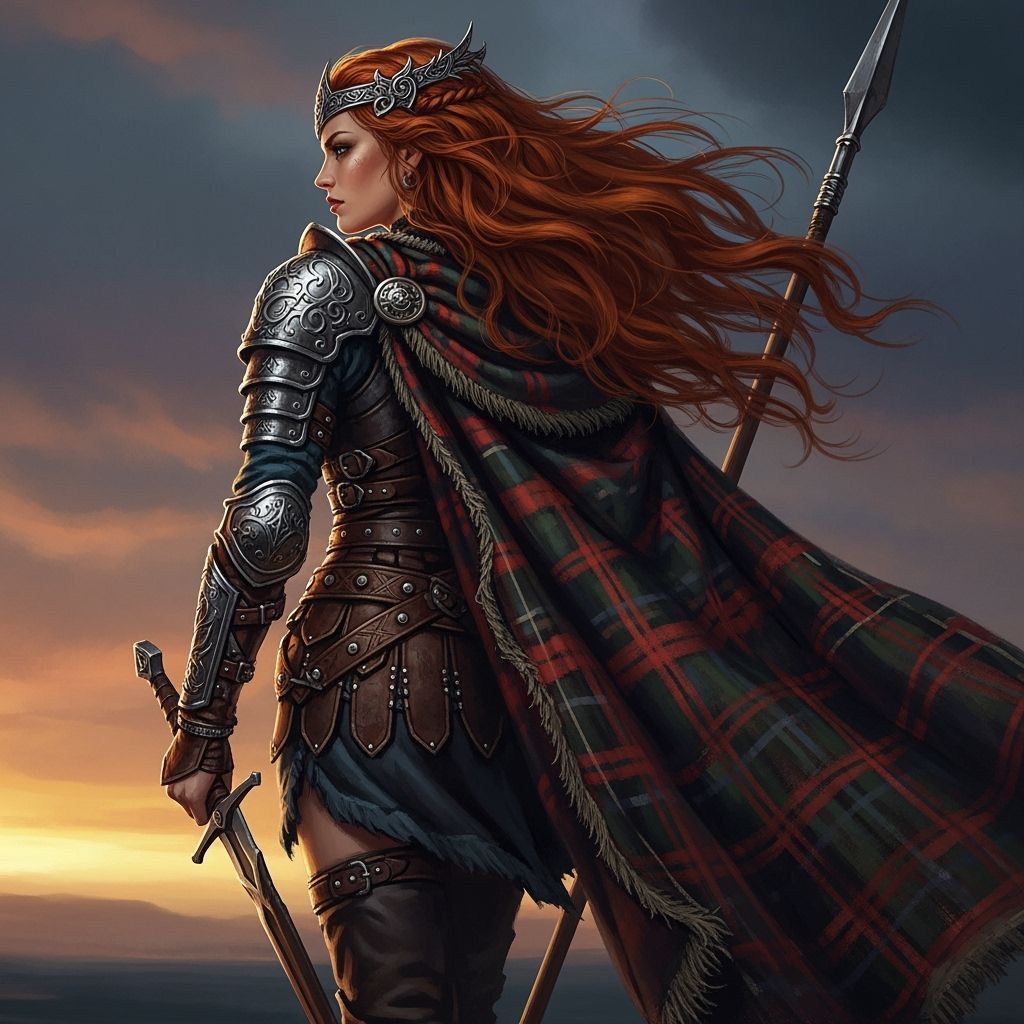 This image shows a Celtic warrior queen with long red hair walking towards the horizon. She is wearing leather armor and a tartan cloak, illustrated with dramatic, cinematic lighting.