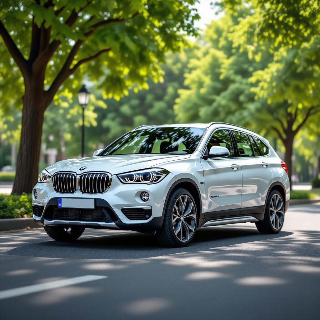 "Front view of a luxury white BMW X1 parked on a clean asphalt road in a shaded outdoor area, surrounded by lush green trees and other vehicles in the background. The car's signature kidney grilles and sleek LED headlights are prominently visible, reflecting natural light. The overall setting is a calm, semi-urban parking space with natural lighting and clear weather."