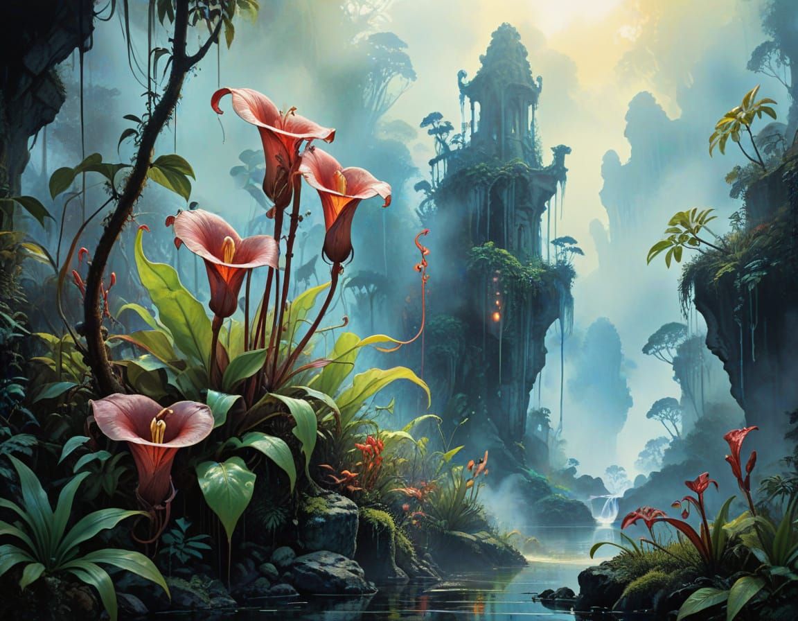 This image showcases a Nepenthes pitcher plant in a jungle, rendered as an ink and watercolor wash drawing. It features a stencil style with ethereal, glowing light and detailed foliage.