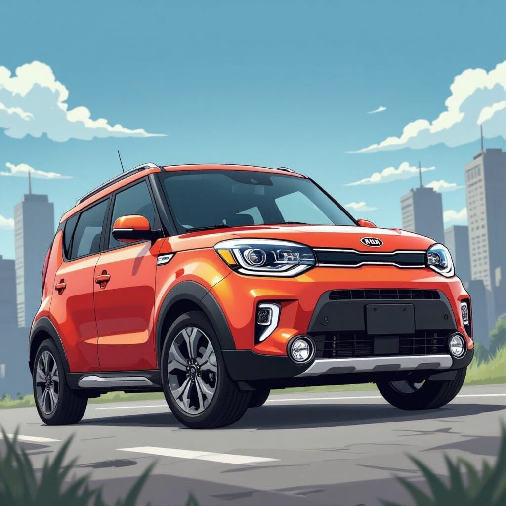 This image shows a Kia Soul reimagined as a superhero in a One Punch Man-inspired anime style. The C-class hero strikes a pose against a simple cityscape backdrop with vibrant colors.