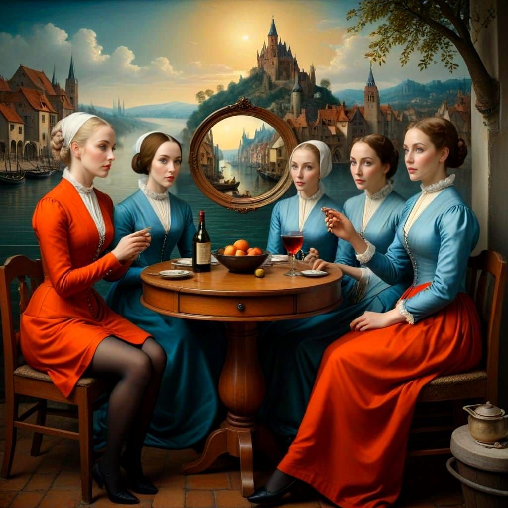 full-height photorealistic formally dressed beautiful mature Victorian ladies by Sargent, Yigal Ozeri, Frederic Leighton, Karol Bak, John William Waterhouse, Christiane Vleugels in a fantastic surrealistic medieval town scene by Hieronymus Bosch, Salvador Dali, Pieter Bruegel the Elder, Giorgio de Chirico ...