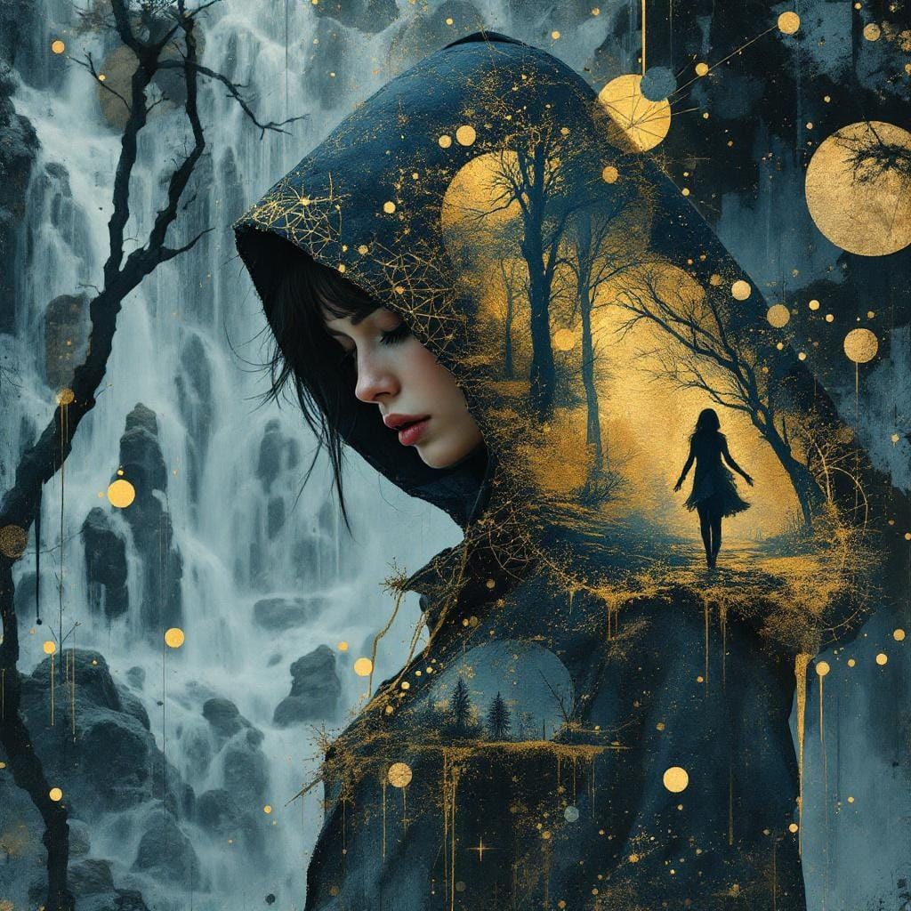 A captivating image of a woman in a hooded garment, showcasing a double exposure effect. The artwork blends abstract expressionism with photorealistic elements, using a rich palette of blues, golds, and earth tones.