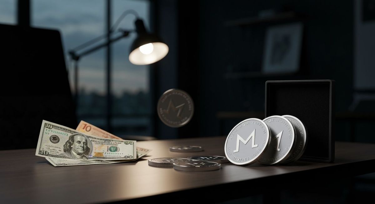 This image captures a dynamic still life of Euro and Dollar bills alongside Monero coins on a desk in a dimly lit office. The arrangement highlights traditional and digital currency, rendered in a dramatic chiaroscuro style.