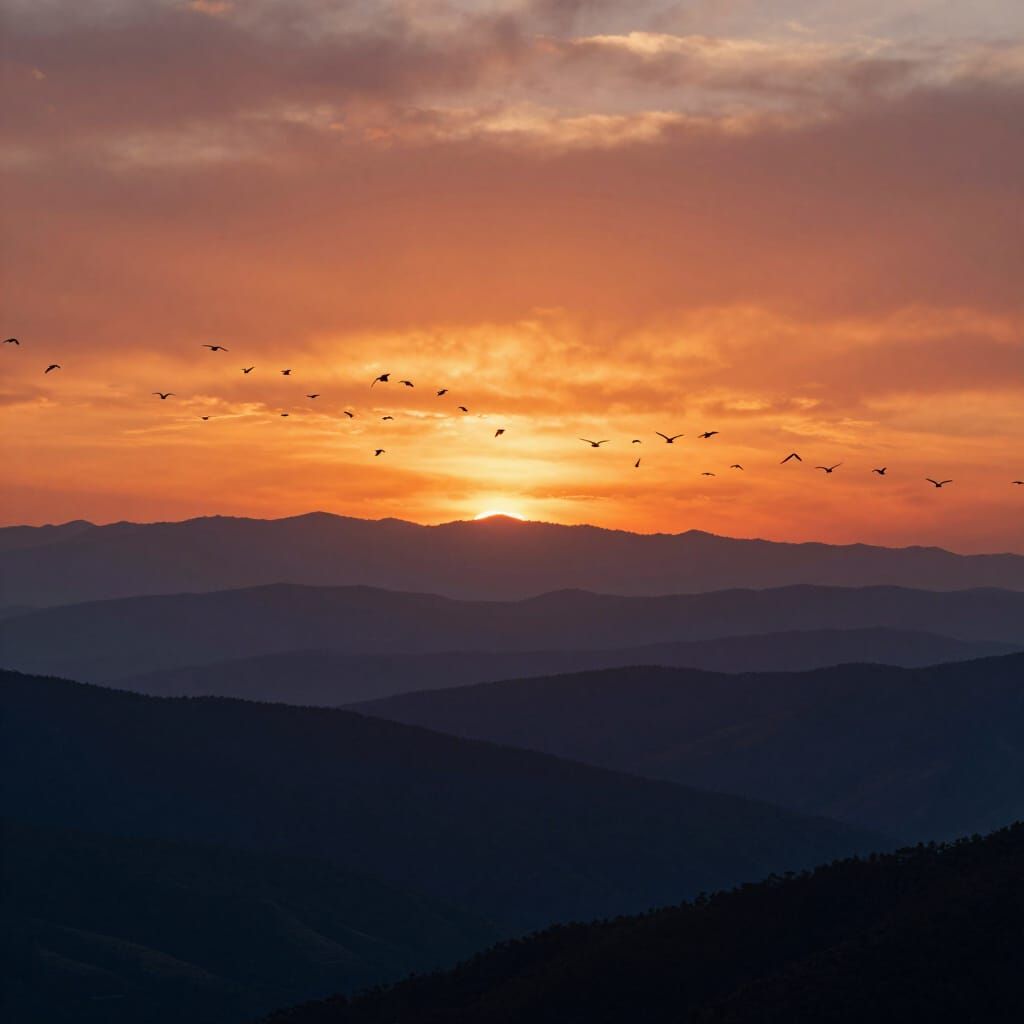 This image depicts a vast, awe-inspiring panorama of silhouetted mountains under a fiery sunset. A flock of birds flies into the luminous distance, rendered with exquisite detail and dramatic lighting.