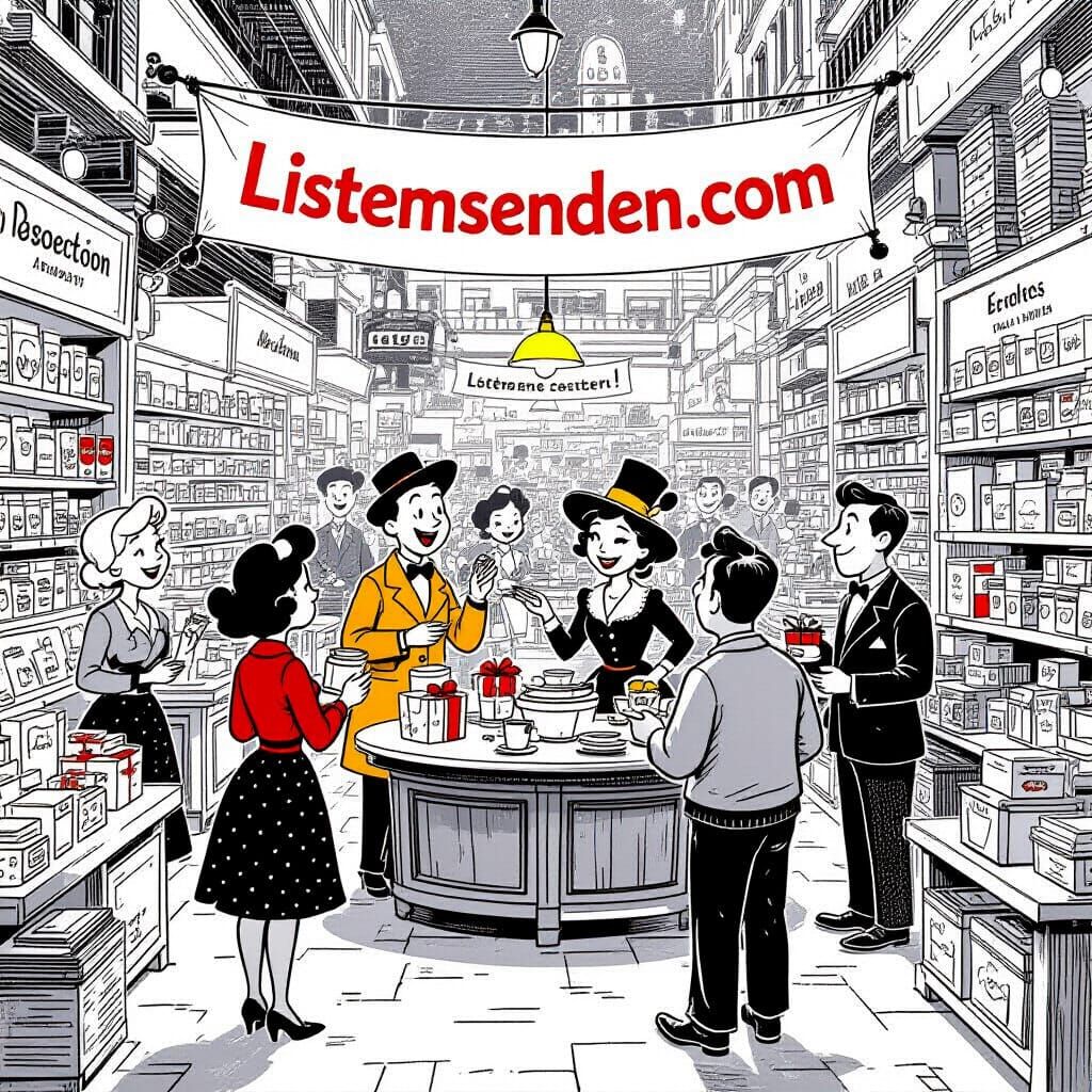 This image shows people creating gift registries on a website, with store owners adding products and friends purchasing gifts. Rendered as a detailed charcoal drawing with dynamic lighting, it captures a bustling digital interface.
