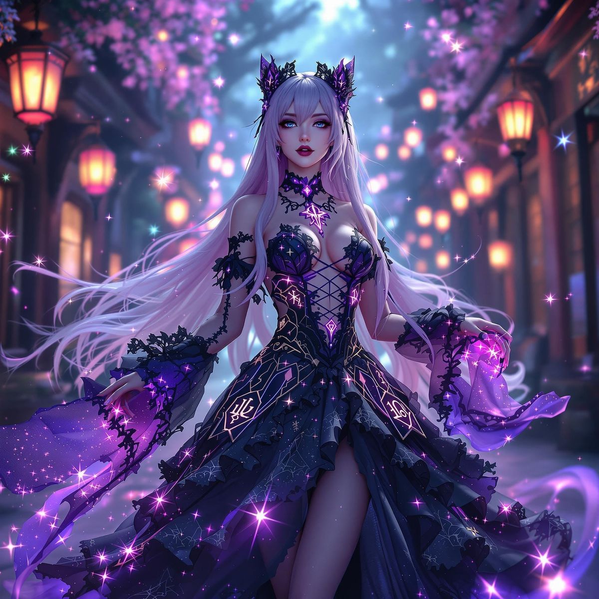 This image shows Kitagawa Marin in a gothic fantasy cosplay, complete with magical runes and glowing accents. The background is an enchanted urban nightscape softly illuminated with violet and blue light.