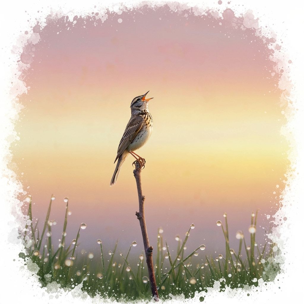 A watercolour painting of a lark singing at dawn. The bird is perched on a branch with dew-covered grass below, set against a pastel sky in a stylized composition.