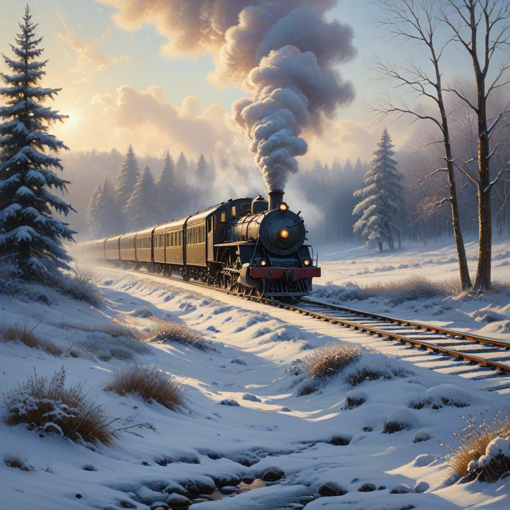 An oil painting capturing a train's serene journey through snow-covered meadows and forests. Ethereal brushstrokes depict frost, steam, and warm window glows under soft winter light.