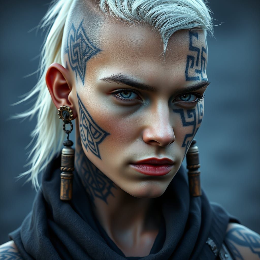 A striking picture of a person with shaved white hair and geometric tribal tattoos. The person gazes intensely at the viewer with decorative ear piercings, set against a blurred, muted blue-grey backdrop.