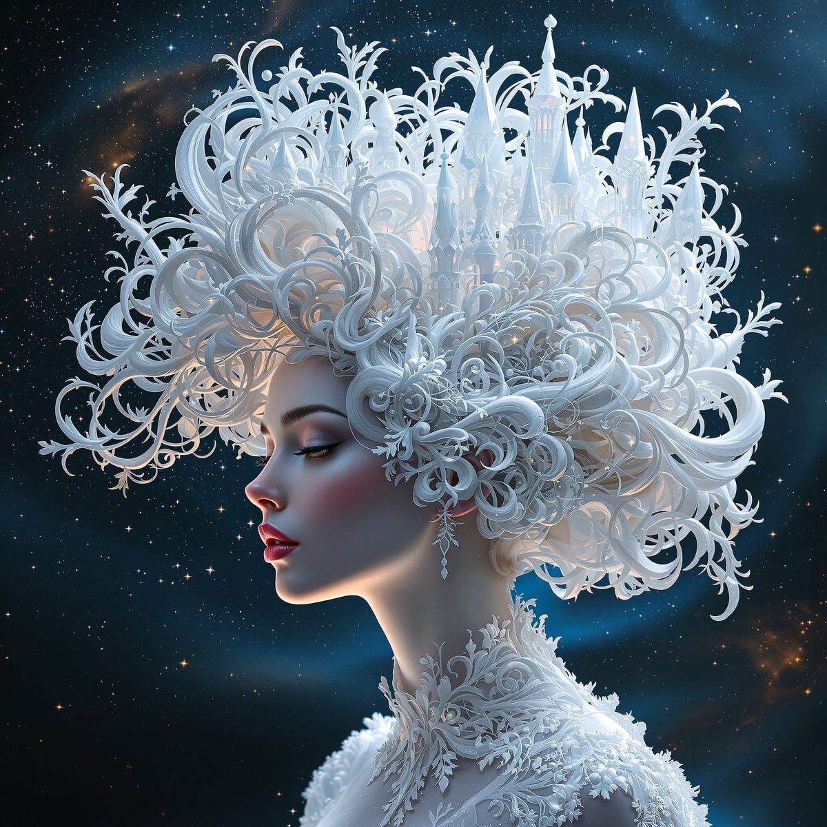 A fantastical, otherworldly white hairstyle masterpiece sculpted like a living work of art. The hair rises into impossible, gravity-defying forms that resemble crystalline spires, flowing marble, and celestial architecture. Each strand gleams with an iridescent frost-like sheen, as though carved from ...