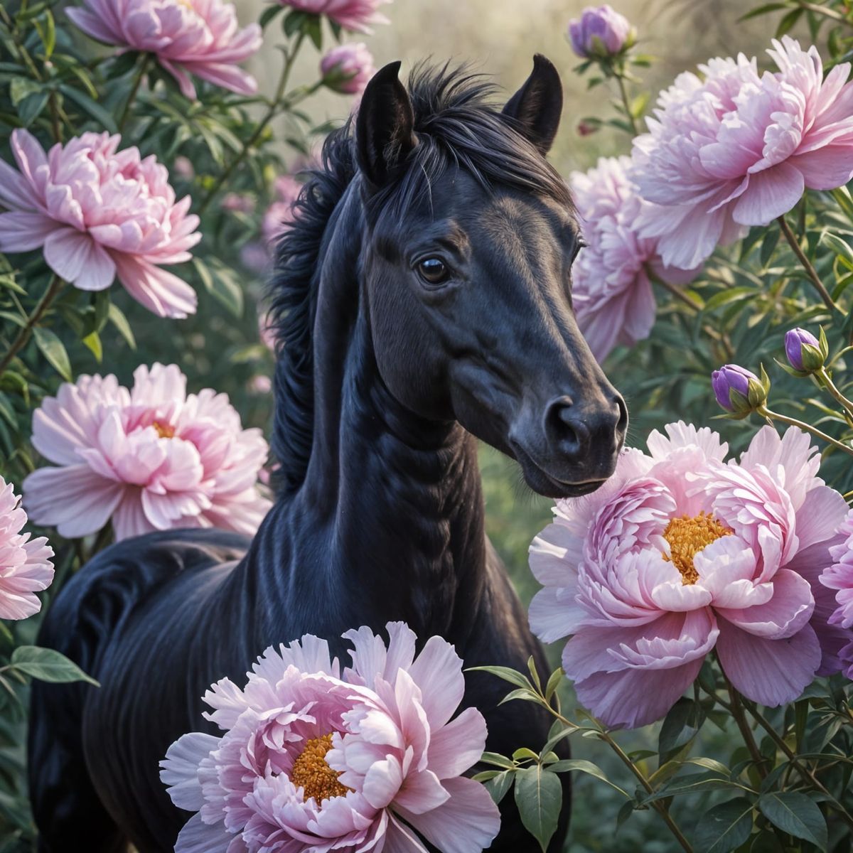 This image shows a tiny, adorable horse-colt hiding among lush purple peonies, with intricate details and warm, inviting lighting.