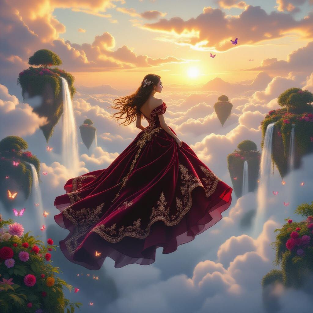 This image shows a young woman in a velvet gown floating above sky gardens. Waterfalls, clouds, sunset light, and magical creatures create a surreal, cinematic atmosphere. The artwork has a hyperrealistic digital painting style.